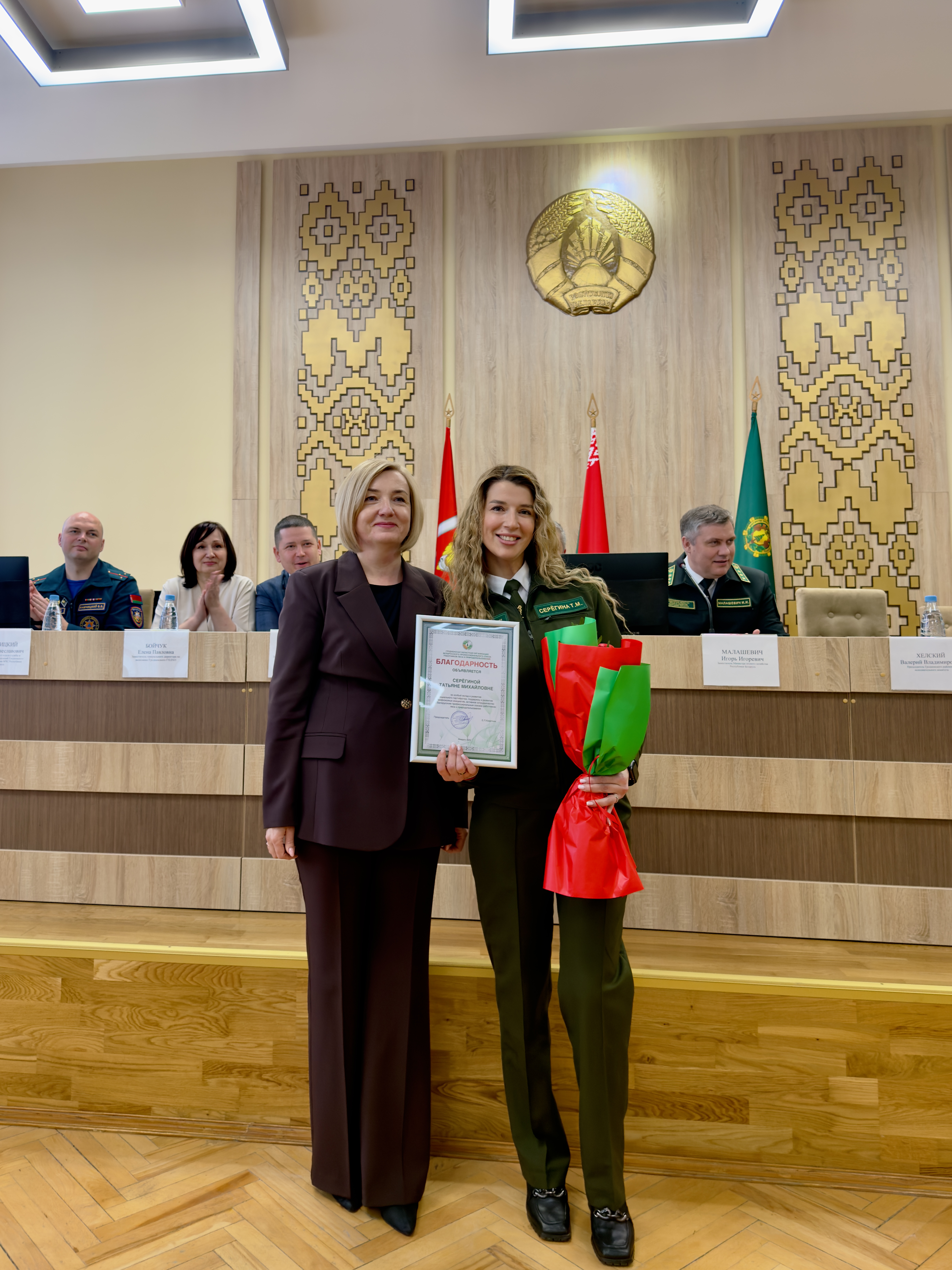 за особый вклад в развитие социального партнерства, поддержку и развитие профсоюзных инициатив, активное сотрудничество с Белорусскими профессиональным союзом работников леса и природопользования , объявляется Благодарность Гродненской областной организации Белорусского профсоюза работников леса и природопользования заместителю руководителя организации по идеологической работе Гродненского лесхоза, Татьяне Серегиной.