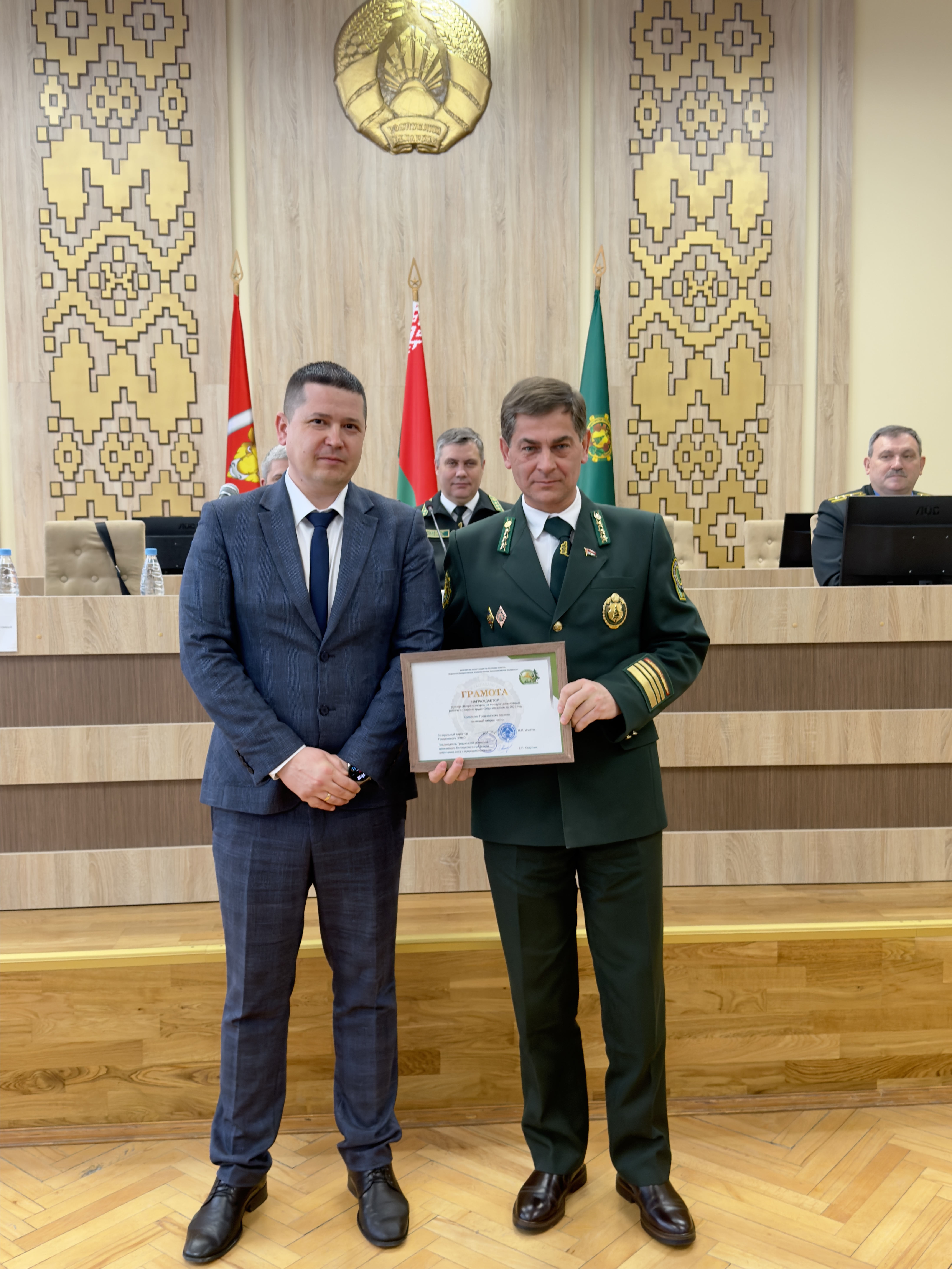 Призер смотра-конкурса на лучшую организацию работы по охране труда среди лесхозов за 2025 год награждается Грамотой ГПЛХО ,Коллектив Гродненского лесхоза занявший почетное второе место.